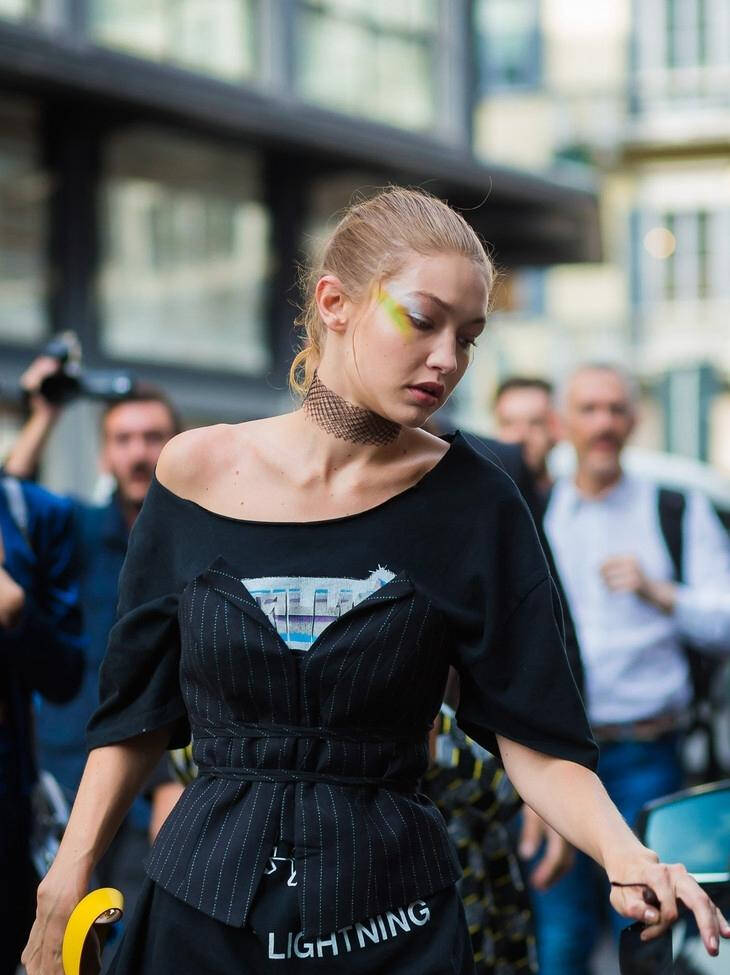 束缚腰封+宽松T恤 Gigi在米兰春夏时装周上以一身黑色宽松T恤出现在街头,在同色束缚腰封的下低调秀出小蛮腰 ,加上露出的香肩,格外吸睛迷人。