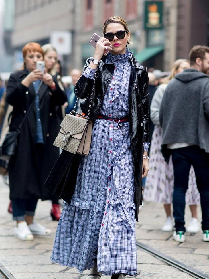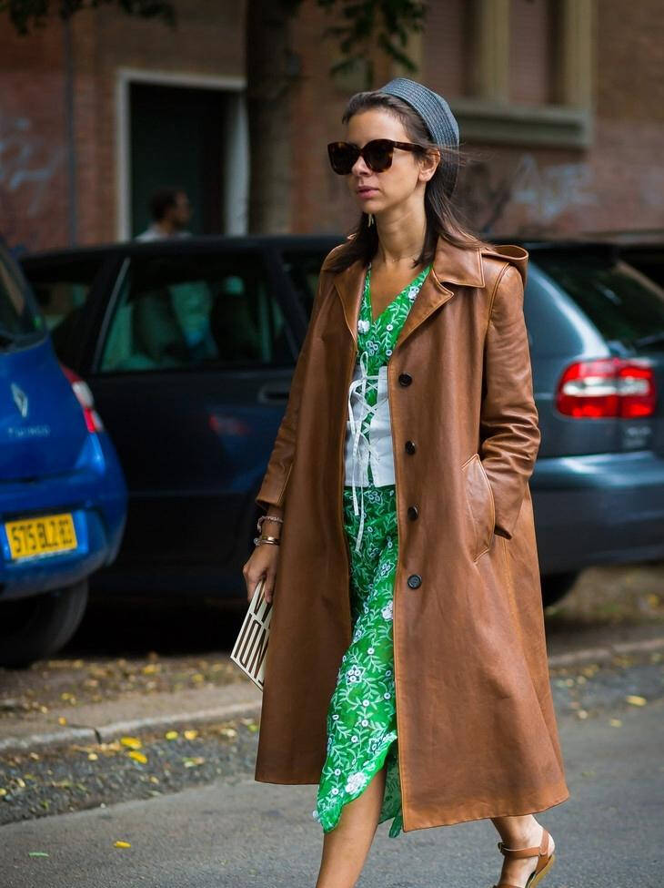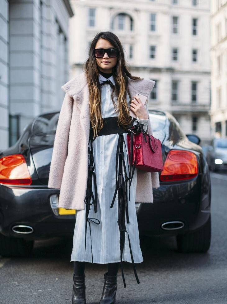 衬衫裙+漆皮外套 在腰带扎在及踝长的衬衫裙外,平衡冗长慵懒的造型,外穿挺括质感的漆皮外套,让你更具飒爽魅力。