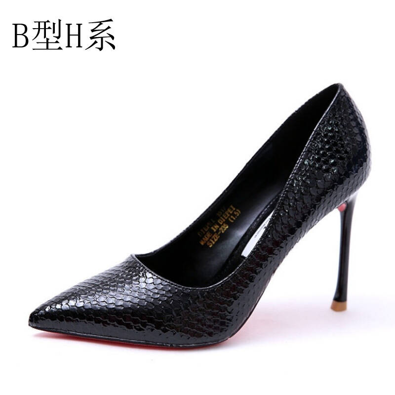 B型H系欧美性感蛇纹女鞋子2017早春新款尖头细高跟鞋时尚单鞋黑色工作鞋 黑色 34