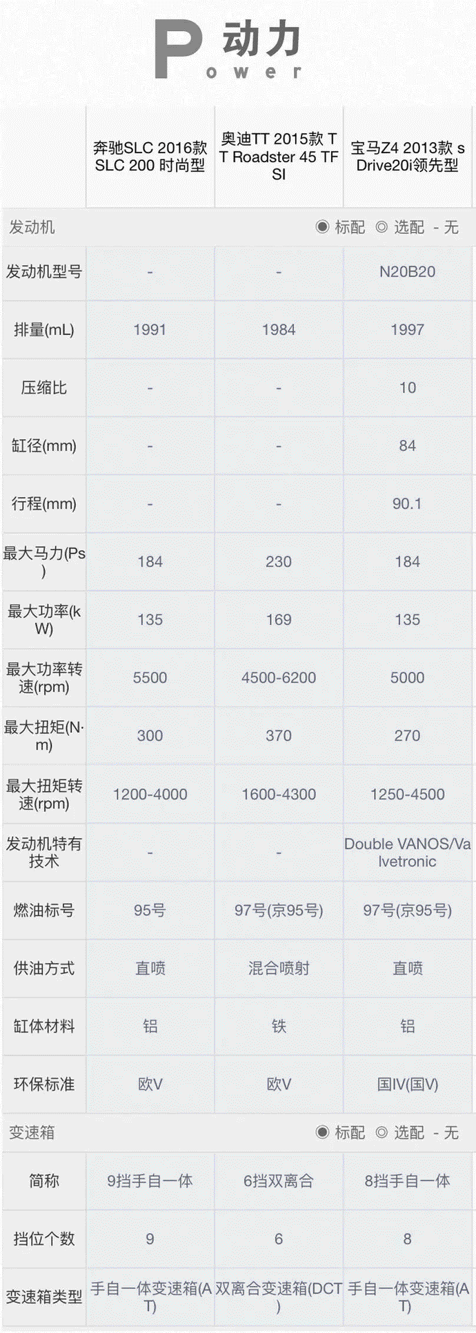 三款车都是搭载2.0T发动机,由于调校的不同,奥迪TT的马力是最大的,宝马Z4和奔驰SLC就不差上下。在变速箱方面,还是奔驰SLC的9挡手自一体带来的驾驶体验更痛快。
