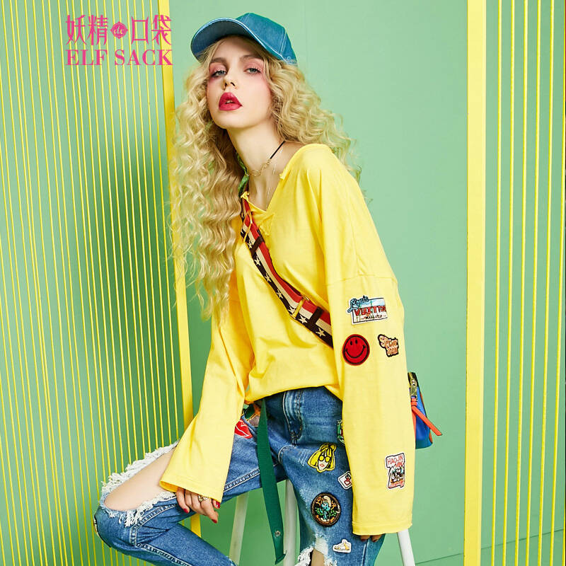 妖精的口袋P 流连忘返 2017新款春装 宽松V领徽章百搭简约长袖T恤 小鸡黄 L