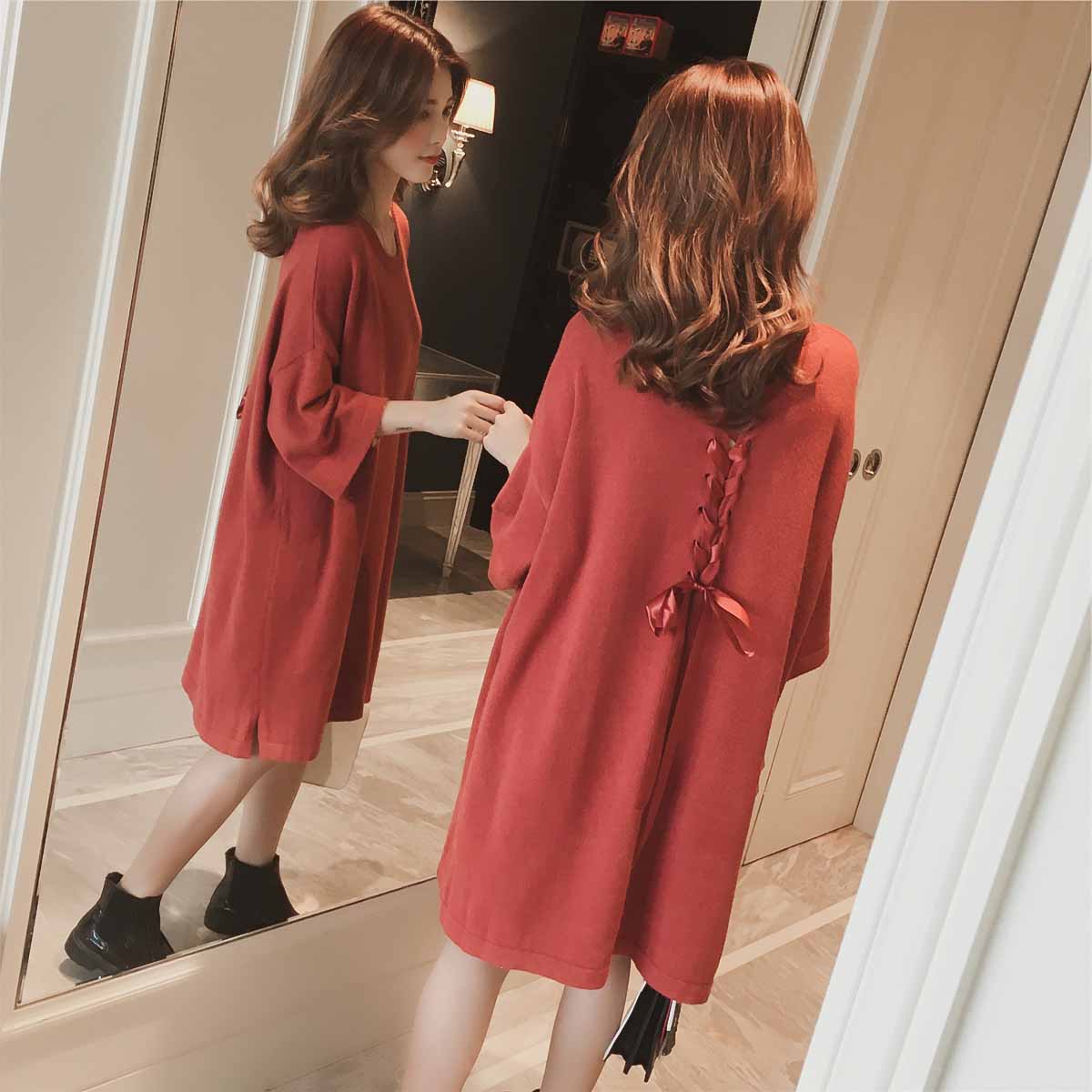 2017秋季新款韩版中长款宽松后背绑带蝴蝶结针织毛衣连衣裙女装