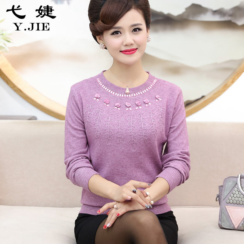 弋婕秋季新款中老年女装妈妈装大码圆领修身针织衫上衣打底衫毛衣