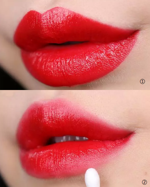 step2、接下来再用洁净的棉签将唇膏最外侧轻轻擦去,将唇部要点放在内侧,有点像曾经画咬唇妆的感觉。
