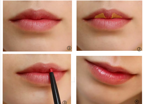 Step2描廓:用唇线笔描出唇部的大致概括,上唇尽量描出唇峰;下唇要比本身唇廓宽一点点;