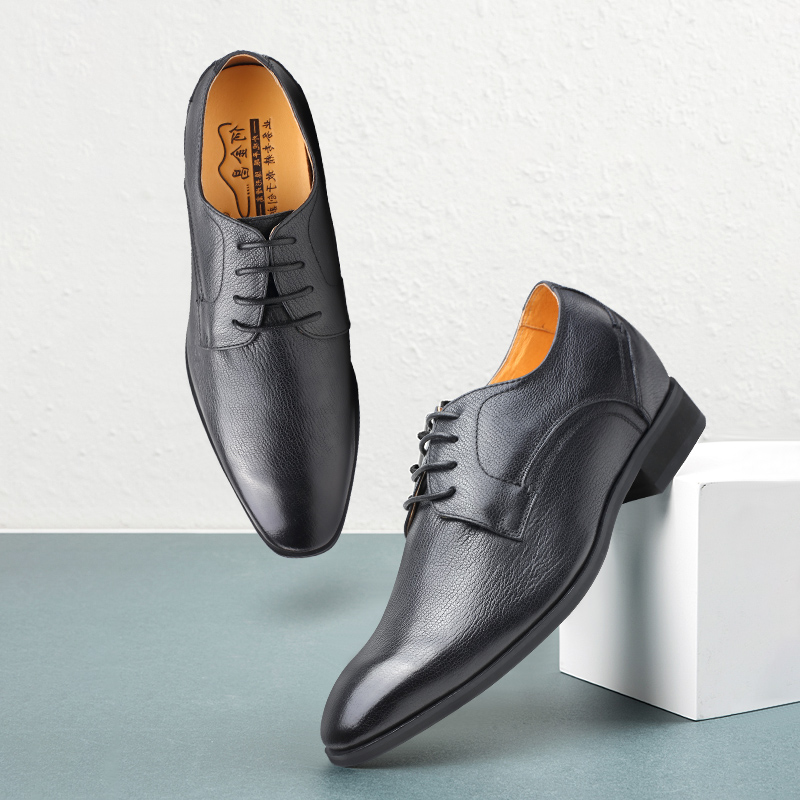 而何金昌内增高鞋在选材上是非常细致的,精选优良的头层牛皮制作,隐形增高7.5cm,经典传统的楦型, 立体饱满 ,标准的正装皮鞋款式。选用头层猪皮作为内里,让您享受清爽透气的舒适体验。