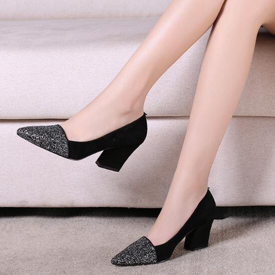 KumiKiwa春季新款2017亮片拼接浅口单鞋女真皮尖头粗跟女鞋高跟鞋
