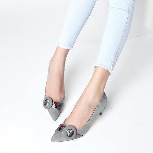KumiKiwa卡米真皮羊反绒面灰色尖头带钻高跟鞋细跟5cm浅口单鞋黑