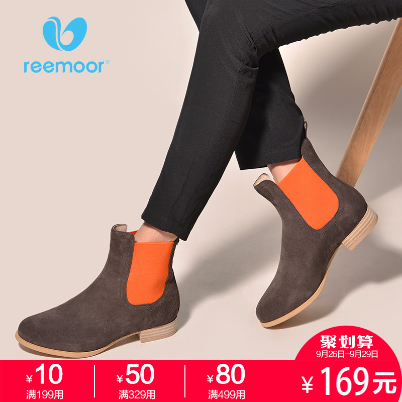 reemoor秋季新款切尔西靴绒面粗跟短靴女英伦风平底靴子睿慕女鞋