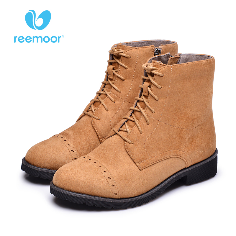 reemoor女鞋秋冬新款英伦风马丁靴女绒面系带粗跟短靴女睿慕女靴