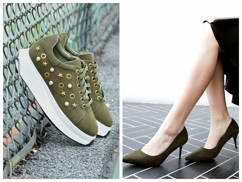 第二款受人追捧的军绿色单品是鞋子。如果是运动鞋,可配棒球衫,加一款斜跨的军绿单肩迷你马鞍包,显得休闲慵懒。如果是尖头高跟鞋,那就配九分浅色直筒裤,显腿型。这样也有鲜明的层次感,让人显得尤为洒脱肆意。