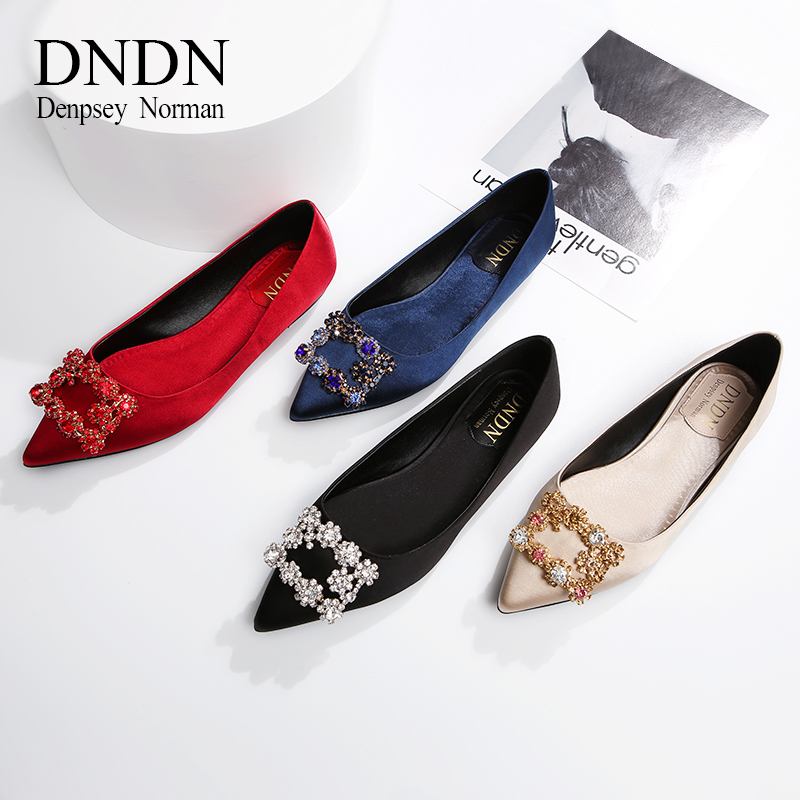 DNDN尖头平底鞋女秋季浅口绸缎水钻方扣单鞋17新款平跟船鞋女婚鞋