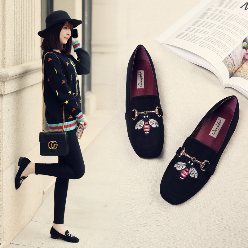 2017春秋韩版新款方头平底单鞋女 金属扣刺绣小蜜蜂低跟乐福鞋