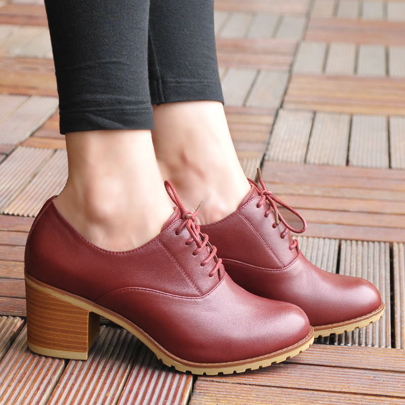 BEAU春秋真皮小白鞋女厚底单鞋女粗跟布洛克女鞋复古英伦风小皮鞋