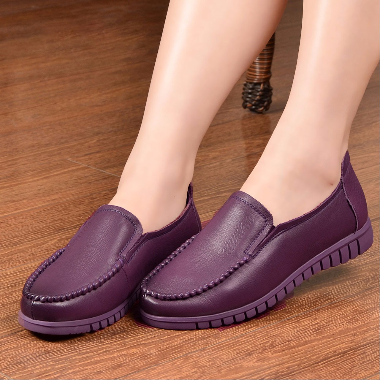 鞋底有防滑纹理上脚舒适自在还比较防滑,紫色高贵稳重,软底鞋上脚轻松休闲舒适度也很高的,可时装可休闲配上裙装裤装都很显气质的。