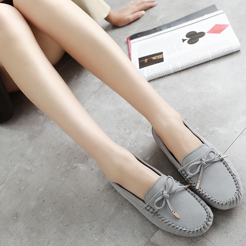豆豆鞋最大的特点就是鞋底舒适度可是蛮好的哦,脚背上点缀蝴蝶结装饰看起来还有一丝俏皮感,浅色系平时不挑服饰都很百搭的。