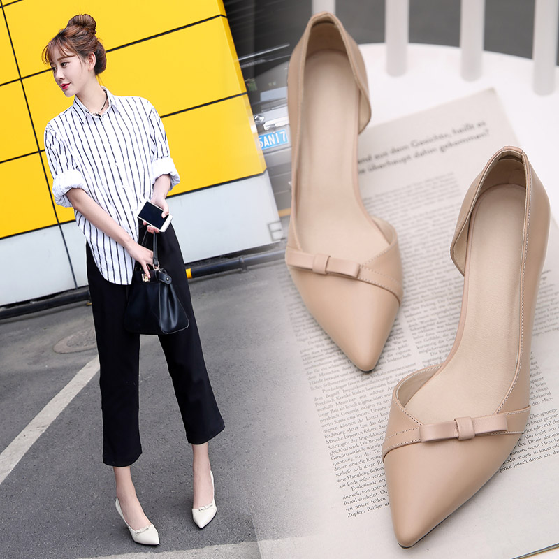 白色高跟鞋细跟女鞋秋蝴蝶结尖头单鞋女裸色婚鞋韩版工作皮鞋子女