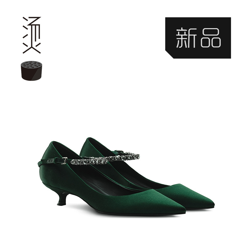 祖母绿真丝绸缎水钻一字带尖头猫跟鞋中跟鞋单鞋