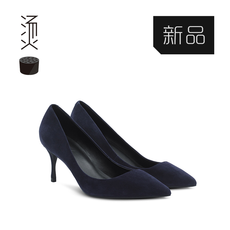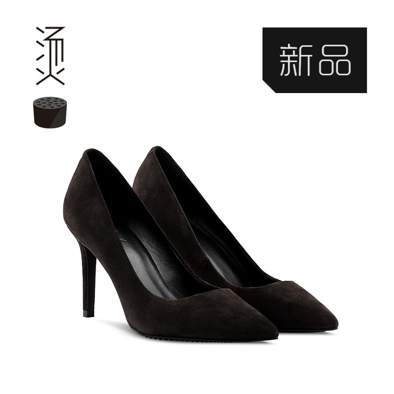 烫社交女鞋时尚黑色羊猄皮羊反绒面尖头高跟鞋细跟中跟浅口单鞋女