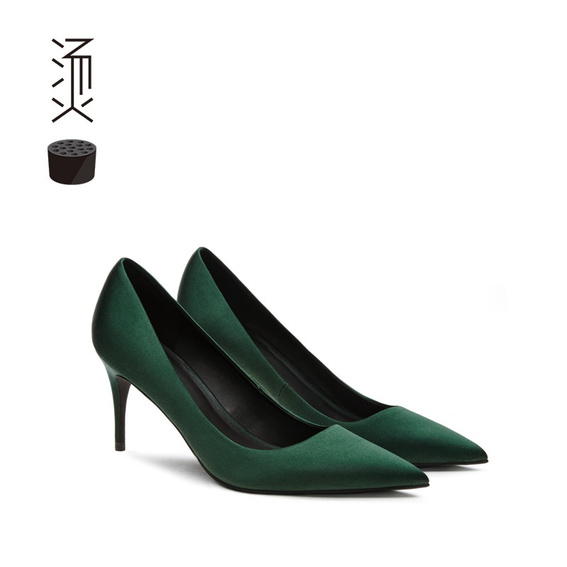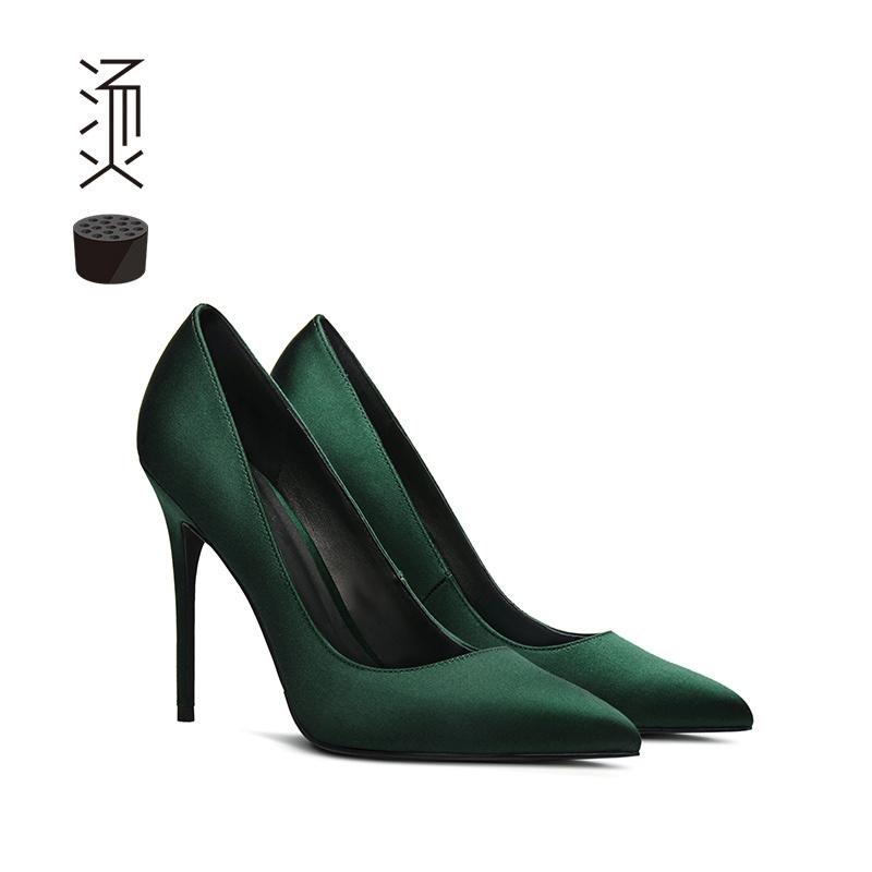 烫社交女鞋祖母绿色简约真丝绸缎尖头高跟鞋女细跟浅口单鞋超高跟