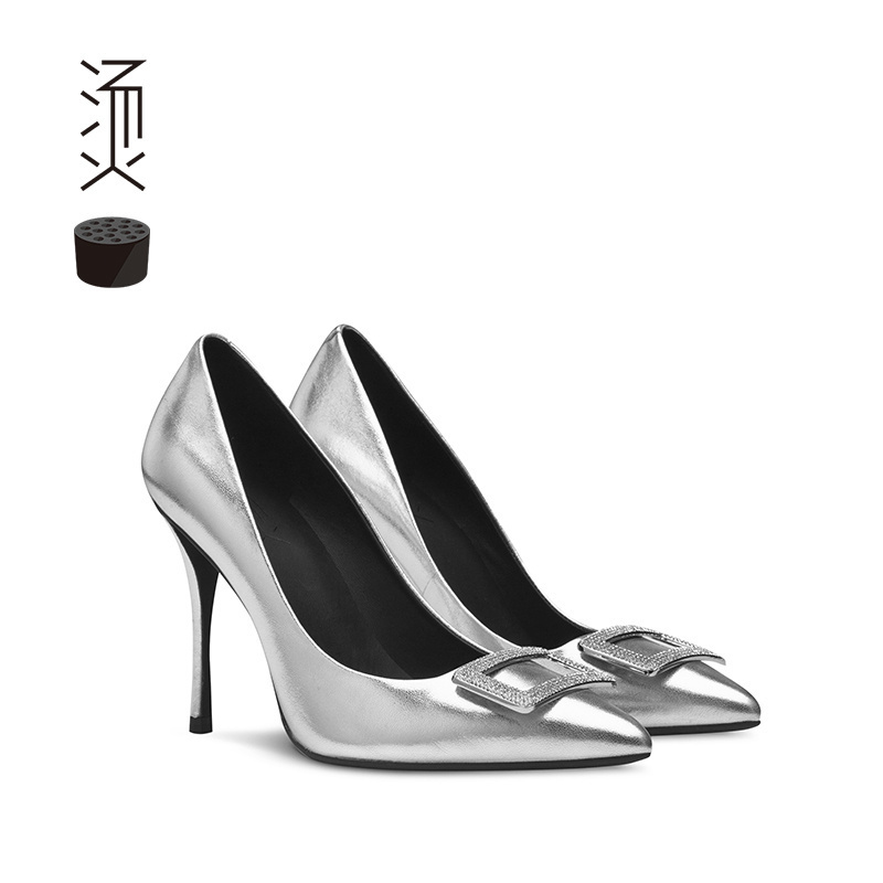 金属银色牛皮方扣水钻尖头细跟高跟鞋单鞋女2017新款