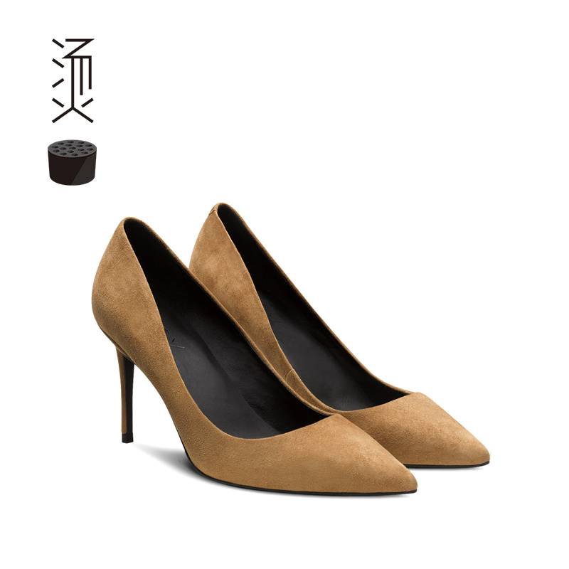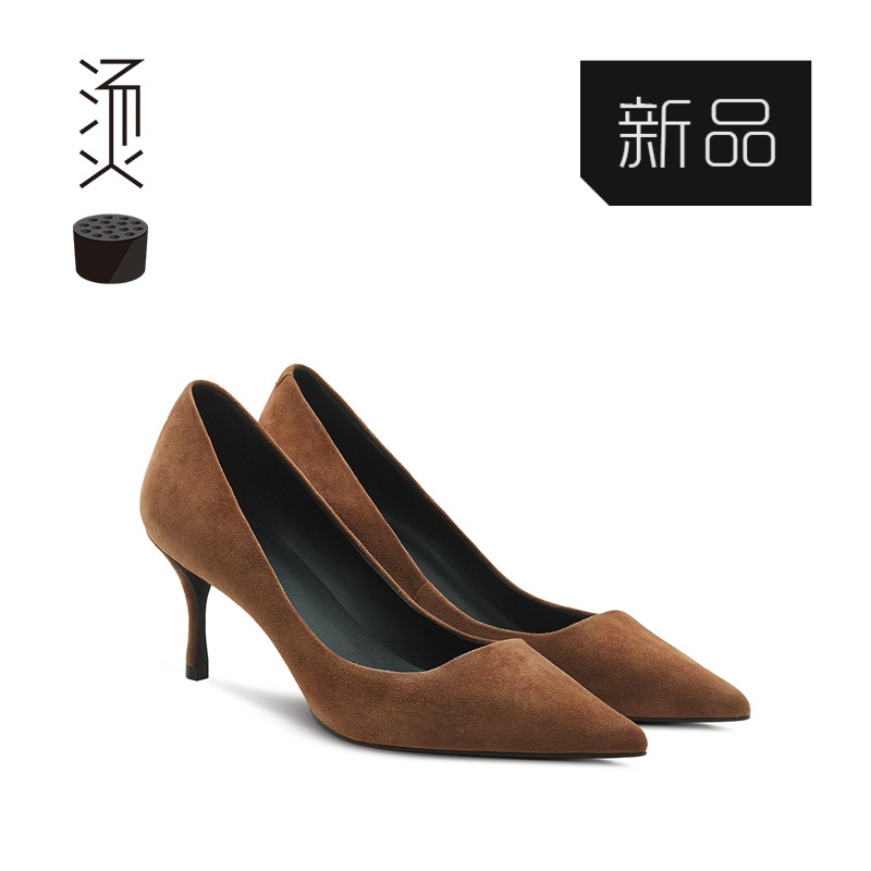 简约焦糖色羊猄羊反绒尖头细跟高跟鞋单鞋2017新款
