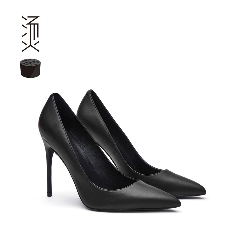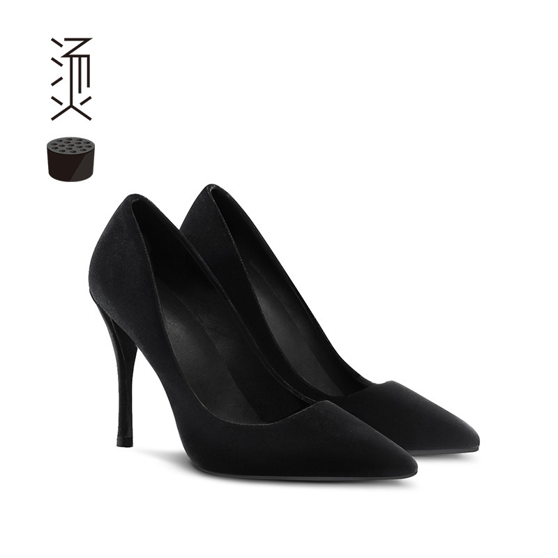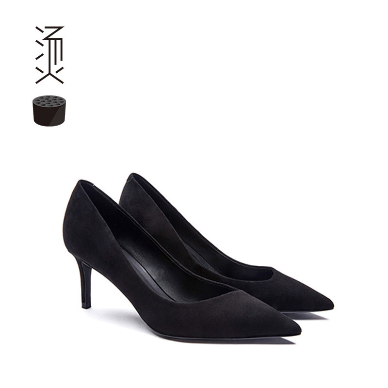 黑色羊皮羊猄反绒面尖头高跟鞋女职业细跟浅口单鞋