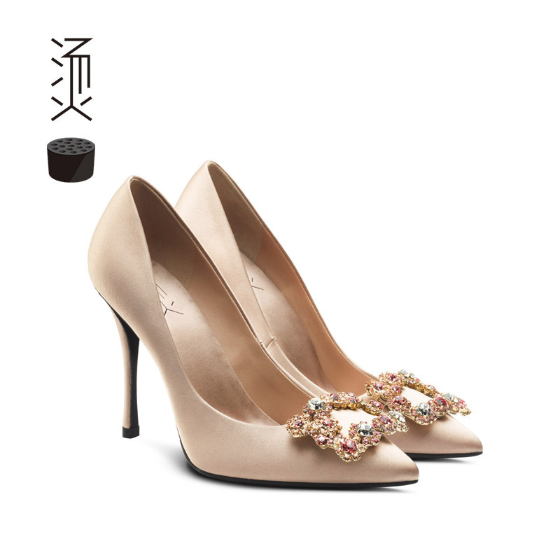 方扣香槟色真丝绸缎水钻细跟高跟鞋尖头浅口单鞋超高跟