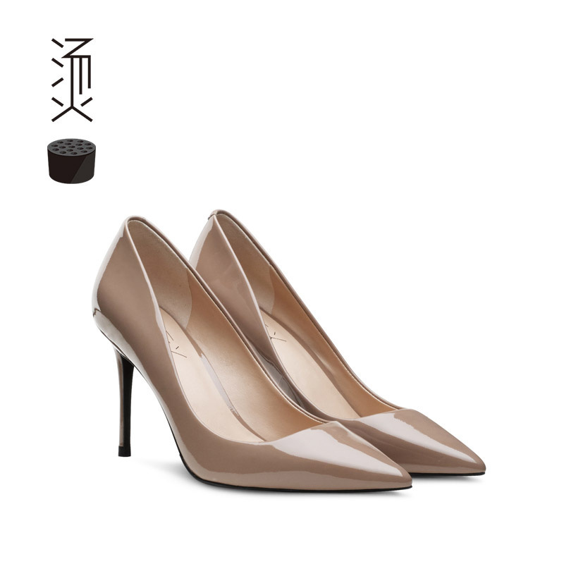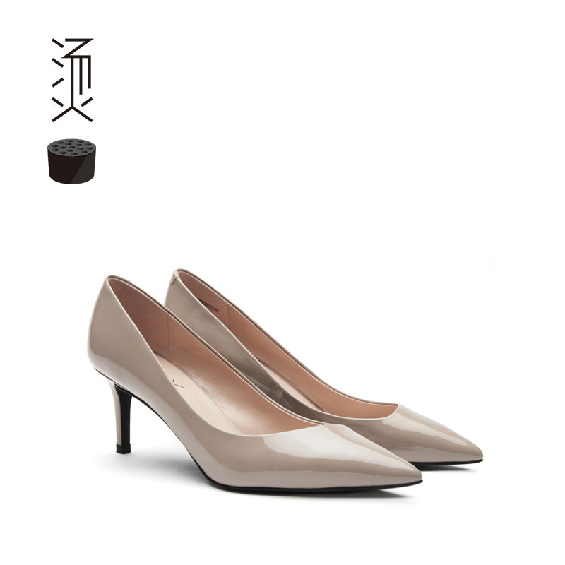 烫社交女鞋夏季时尚真皮浅口单鞋女中跟裸色漆皮尖头高跟鞋女细跟