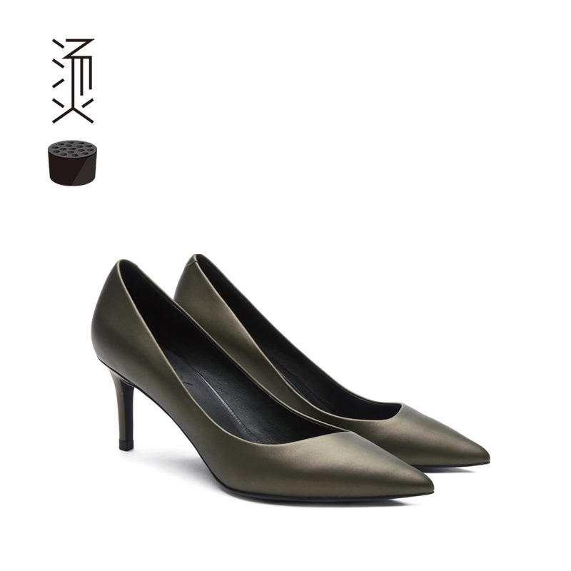 银色灰色橄榄绿色珠光牛皮浅口尖头中跟细跟高跟鞋单鞋