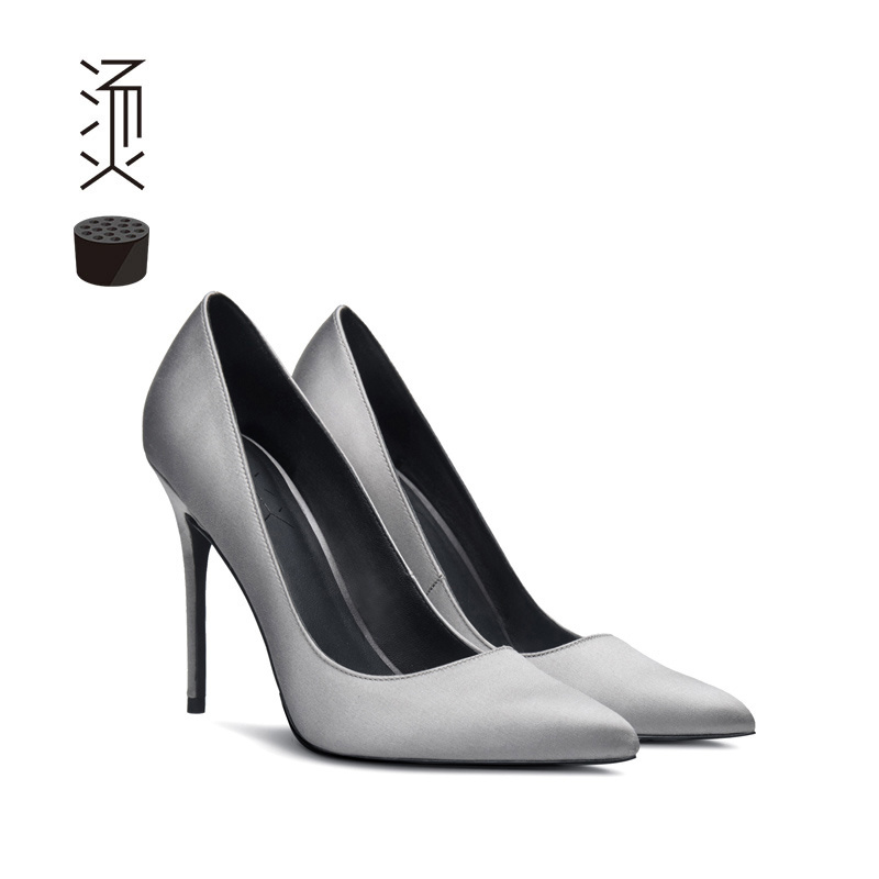 烫社交女鞋银色灰色简约真丝绸缎尖头高跟鞋女细跟浅口单鞋超高跟