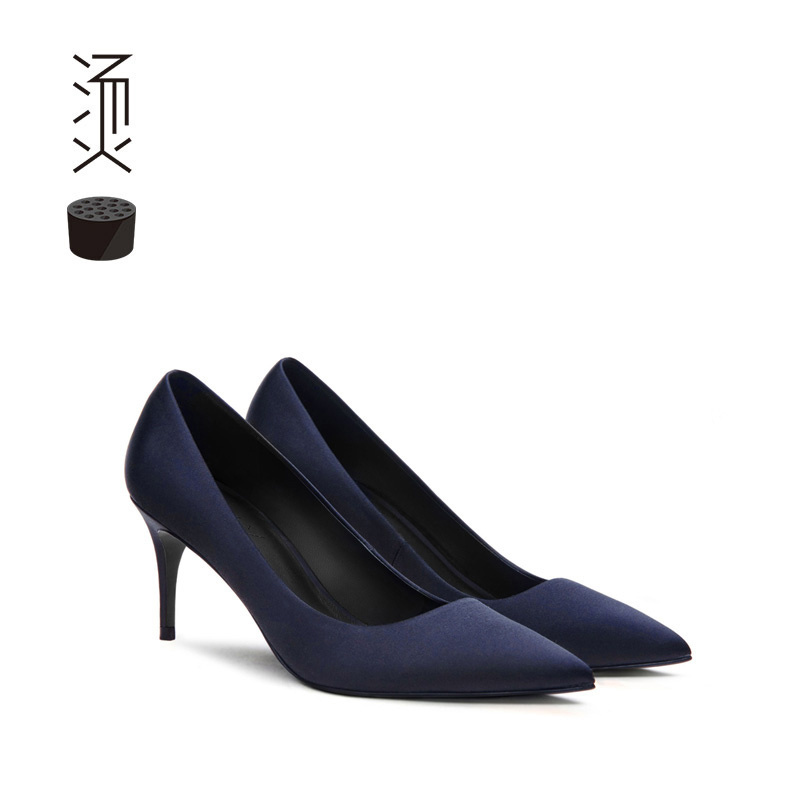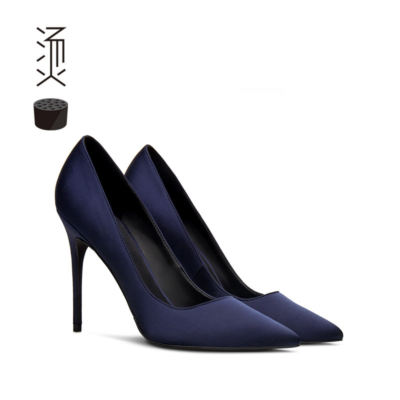 蓝色时尚简约真丝绸缎尖头高跟鞋女细跟浅口单鞋超高跟