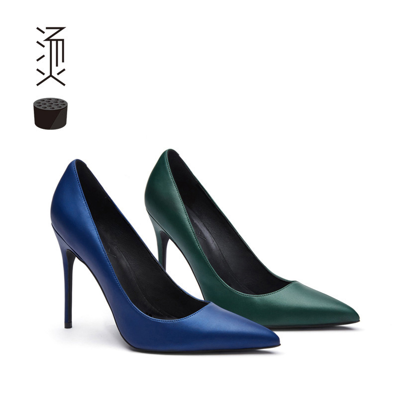 蓝色绿色简约珠光牛皮真皮尖头高跟鞋女细跟单鞋超高跟