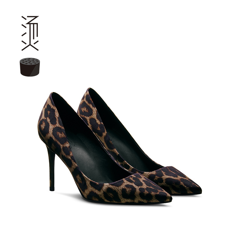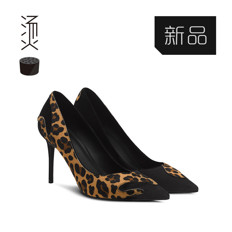 豹纹马毛拼黑色羊猄皮浅口尖头细跟高跟鞋单鞋2017新款