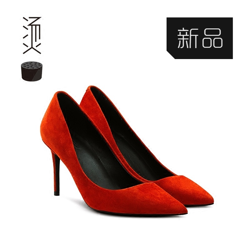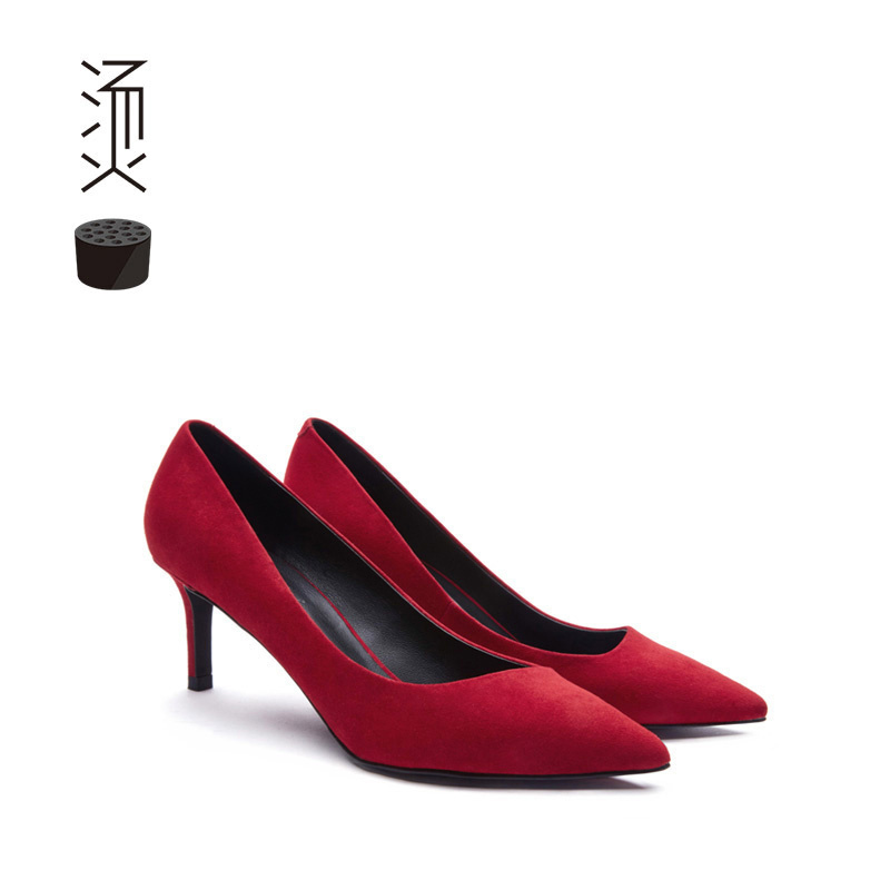烫社交女鞋时尚红色羊猄羊反绒尖头高跟鞋细跟中跟浅口单鞋女婚鞋