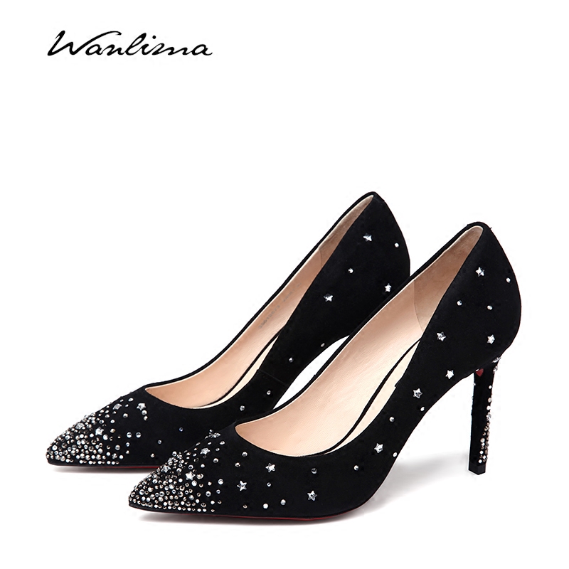 wanlima2017秋冬新款烫钻社交女鞋性感尖头高跟鞋女浅口女单鞋
