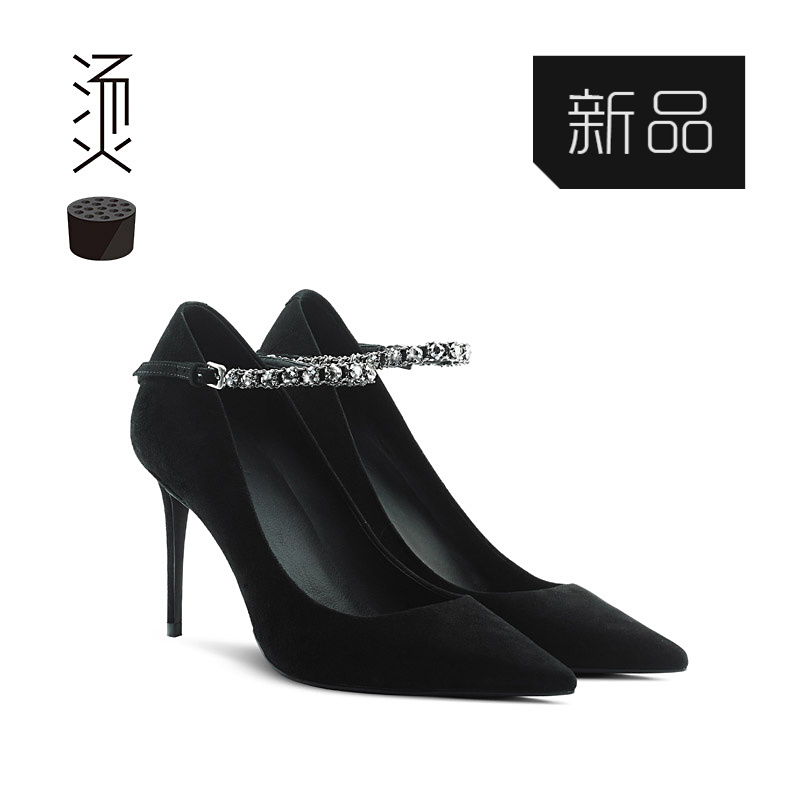 黑色羊猄羊反绒水钻绑带一字带细跟尖头高跟鞋单鞋