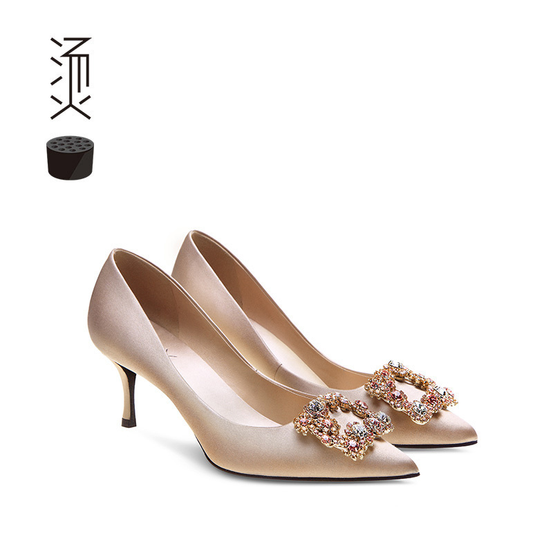方扣香槟色真丝绸缎水钻中跟细跟高跟鞋尖头浅口单鞋