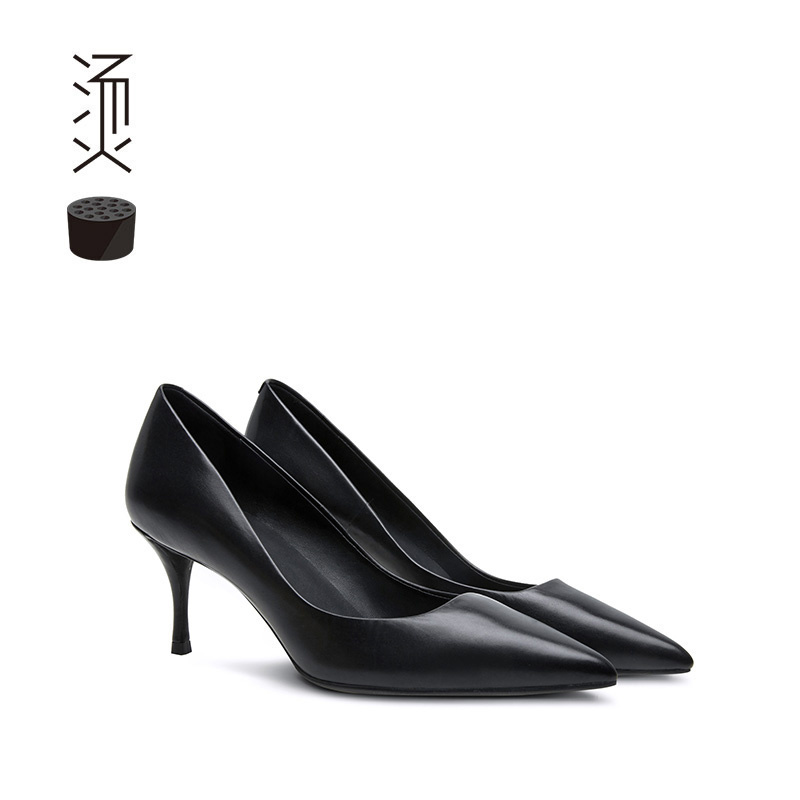 黑色真皮小牛皮尖头浅口中跟细跟高跟鞋通勤单鞋女时尚