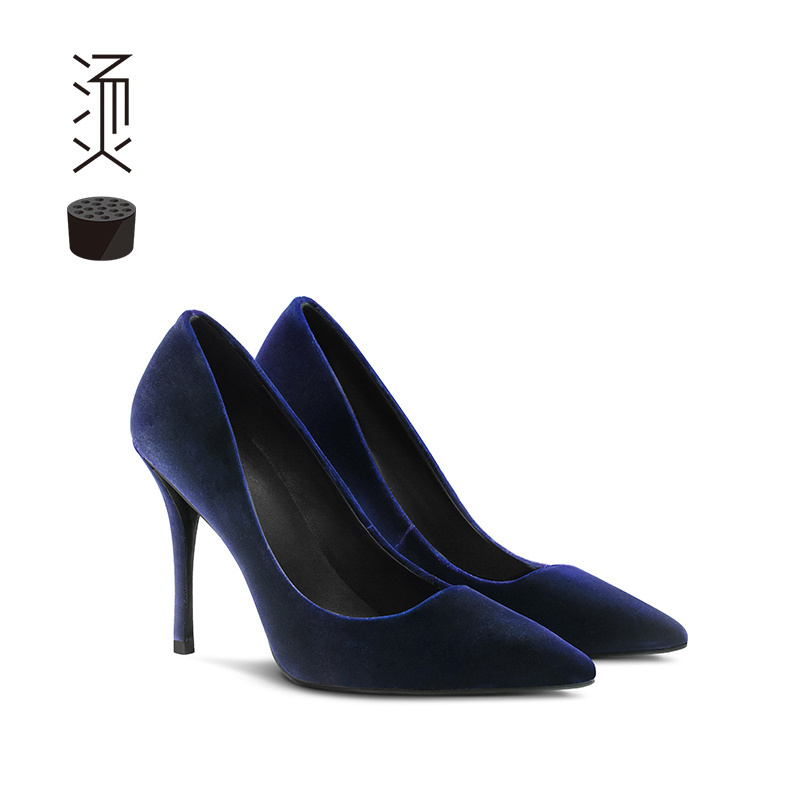 深蓝色天鹅绒浅口尖头超高跟细跟单鞋女高跟鞋欧美宴会