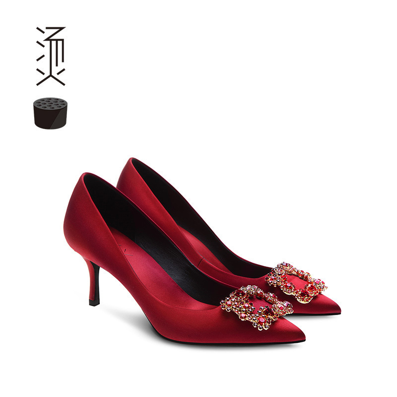 烫社交女鞋方扣红色真丝绸缎水钻中跟细跟高跟鞋尖头浅口单鞋婚鞋