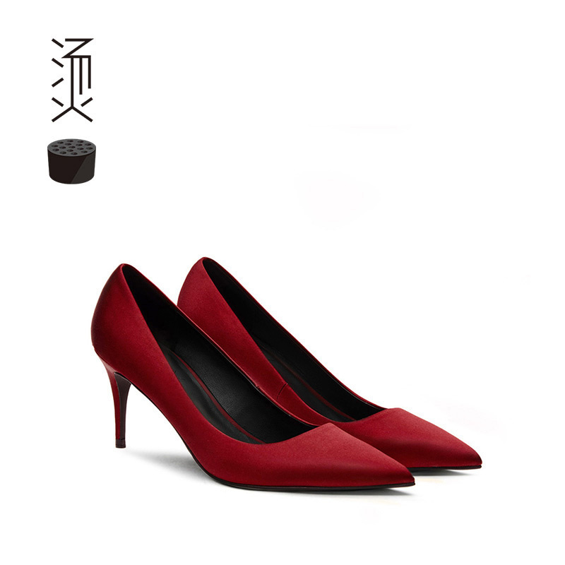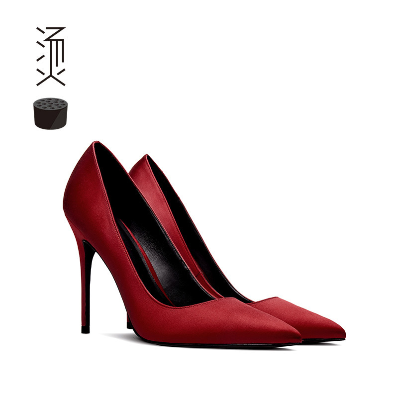 红色简约真丝绸缎尖头高跟鞋女细跟浅口单鞋超高跟婚鞋