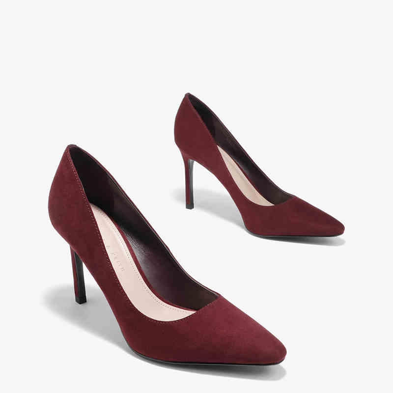 通勤风尖头时尚高跟鞋,简约的纯色设计,时髦百搭。酒红色和粉色两色,显嫩又洋气。流行的绒面面料,尖头细高跟,上脚很美丽。做工精细,穿起来也养脚,深受职场女人的喜爱。