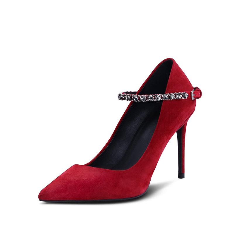 烫社交女鞋红色羊猄羊反绒水钻绑带一字带细跟尖头高跟鞋