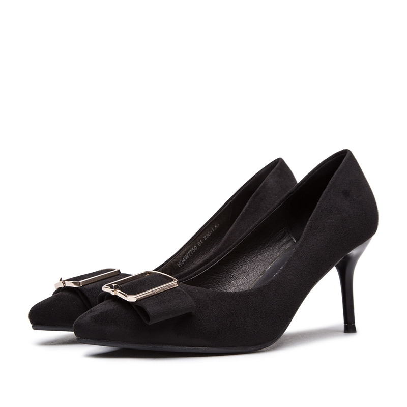 热风2017秋季新款潮流尖头浅口女士方扣烫钻细高跟鞋单鞋