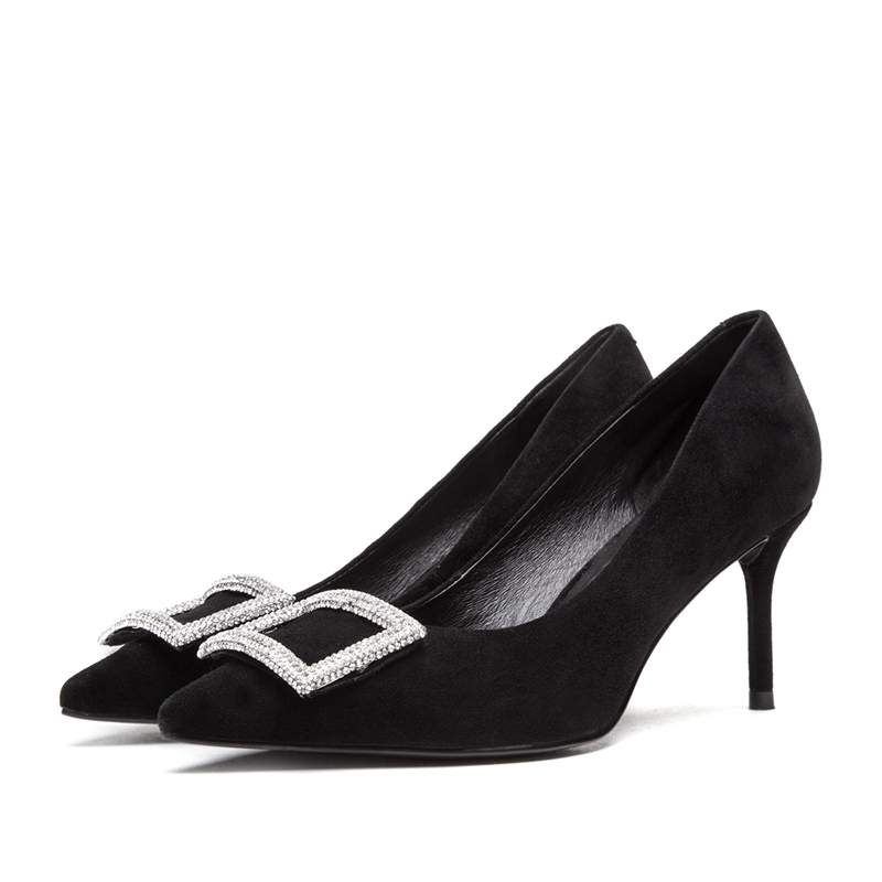 热风方扣烫钻细高跟鞋,羊反绒鞋面,质感细腻柔软。方形的水钻饰扣,抢眼吸睛。酒杯形的高跟,拉长双腿比例,挺拔腰肢,尽显女性曼妙身姿,优雅又显气场,凸显精致女人的迷人韵味!