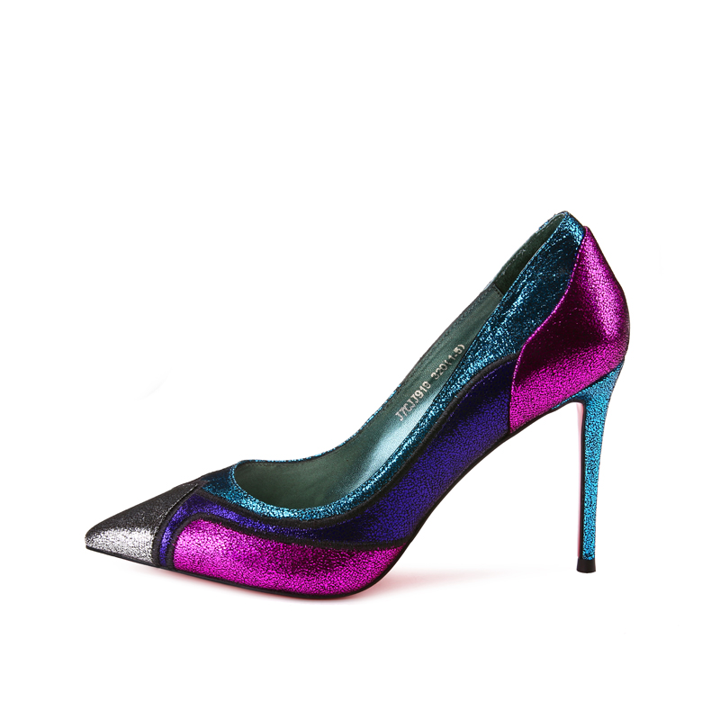 欧美风尖头拼色跟鞋,亮丽的彩色拼色,让你时髦过秋。羊皮面和内里,上脚后柔软舒适。爆裂羊皮,明快的湛蓝,高贵的深紫,魅惑的玫红,色彩斑斓,绚丽夺目,让人叹为观止。女人要有一双好鞋子,有了它轻松让在人群中脱颖而出,体现不凡。