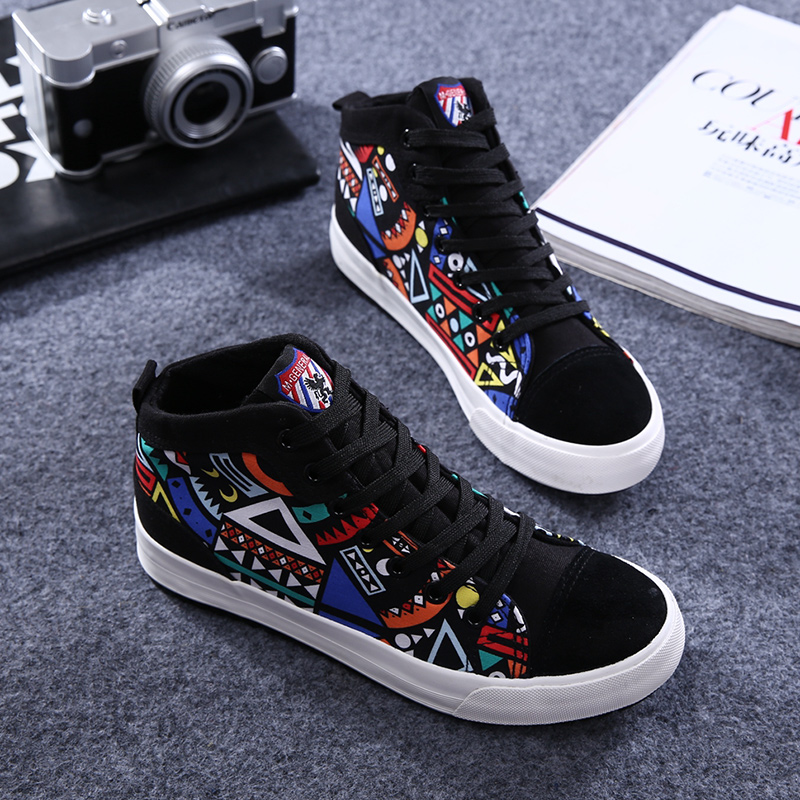 2017秋季新款布鞋涂鸦高帮鞋平底帆布鞋女韩版潮百搭学生休闲板鞋