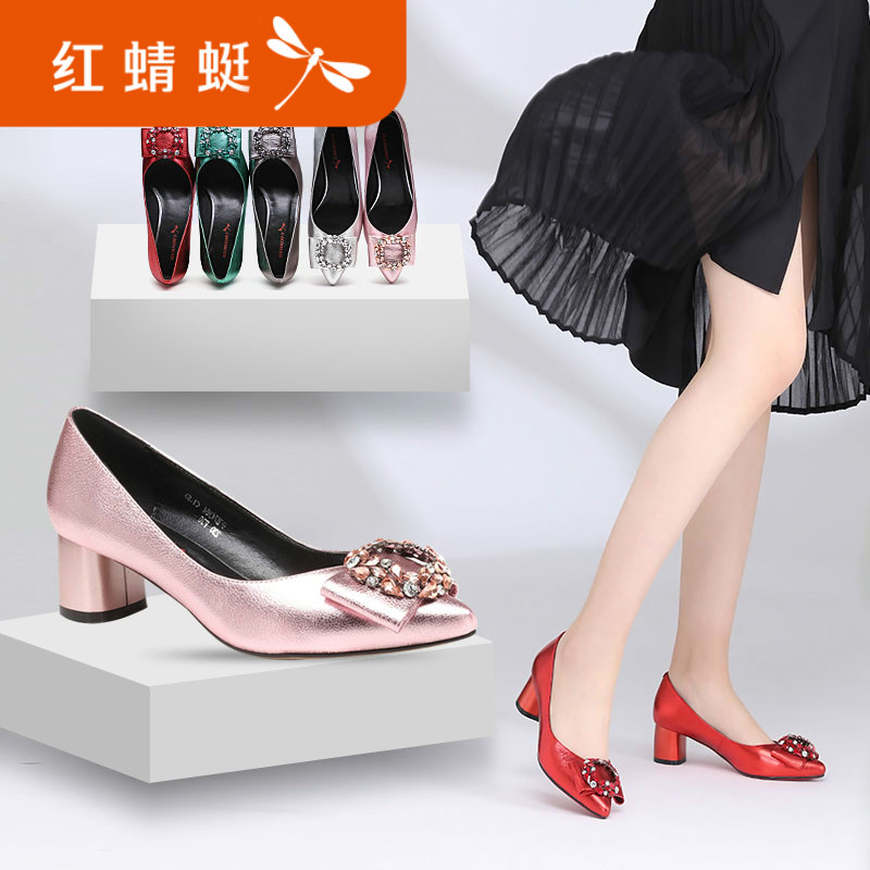 红蜻蜓女鞋 2017新款春秋粗跟尖头水钻真皮浅口中跟女鞋单鞋婚鞋