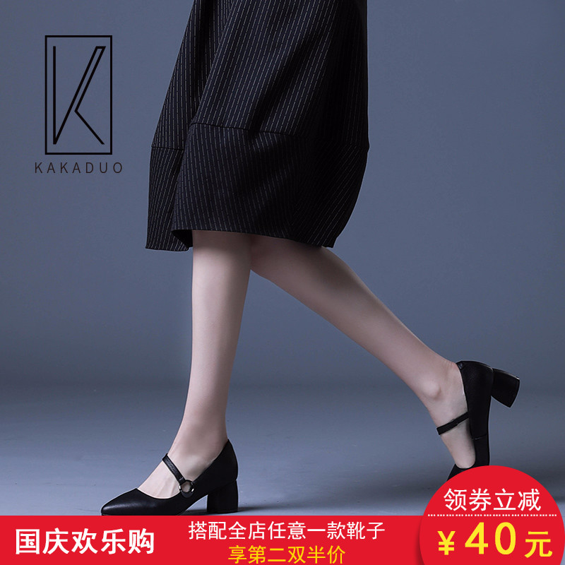 单鞋女粗跟新款时尚松紧一字扣套脚真皮百搭尖头高跟浅口女鞋中跟